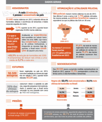 De acordo com as informações, a cada 10 minutos, 1 pessoa é assassinada no país. Foram 53.646 mortes violentas em 2013, incluindo vítimas de homicídio doloso e ocorrências de latrocínio e de lesões corporais seguidas de morte. O anuário propõe que o país reduza em 65,5% os homicídios até 2030, com compromisso de reduzir tais crimes a uma média de 5,7% a cada ano.