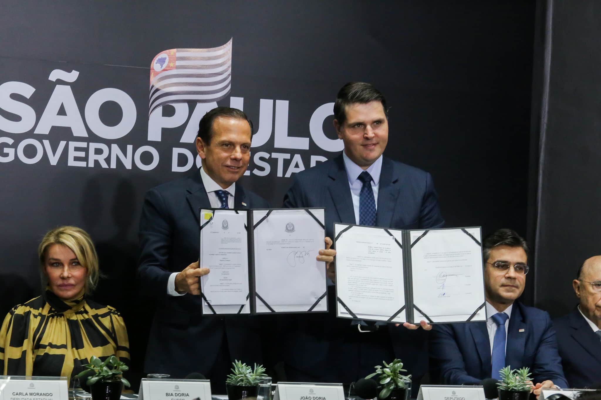 Doria e o presidente da Alesp (Assembleia Legislativa de São Paulo), Cauê Macris (PSDB), participaram da cerimônia de promulgação da PEC (proposta de emenda à Constituição) e sanção do PLC (Projeto de Lei Complementar) que compõem a reforma, no Palácio dos Bandeirantes, sede do governo estadual.