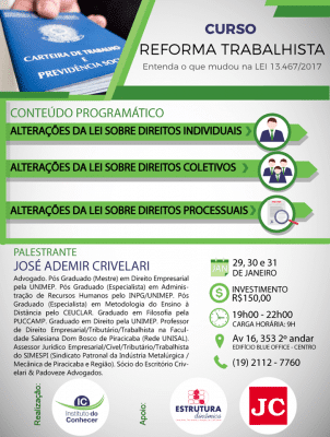O Instituto do Conhecer e a Estrutura Dinâmica realizarão o curso Reforma Trabalhista: entenda o que mudou. Ministrado pelo Dr. José Ademir Crivelari, mestre em Direito Empresarial pela Unimep e especialista em Administração de Recursos Humanos, o curso será nos dias 29, 30 e 31 de janeiro e é imperdível para empresários, advogados, gestores e profissionais de RH que precisam estar por dentro das novas regras das leis trabalhistas. Informações no Instituto do Conhecer pelo telefone 2112-7760.