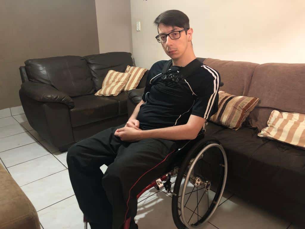 Preso a uma cadeira de rodas, seu maior desejo é conseguir um pouco mais de autonomia e principalmente diminuir as dores que tanto o incomodam: “Esta cadeira nós conseguimos há 12 anos para ele na prefeitura. Neste tempo ele cresceu, o físico mudou, a cadeira se desgastou e infelizmente não atende mais às necessidades. Tanto é que colocamos uma mochila nas costas dele para se manter preso devido ao problema na coluna (escoliose)”, relata a mãe Tereza Dietrich.