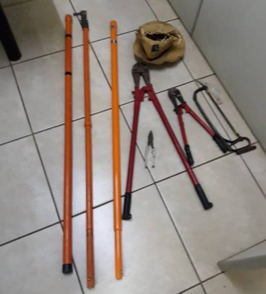 Com os suspeitos, os agentes encontraram hastes e outros objetos utilizados para desligar disjuntores elétricos, o que possibilitaria o furto dos materiais. O trio foi encaminhado à Delegacia do município.