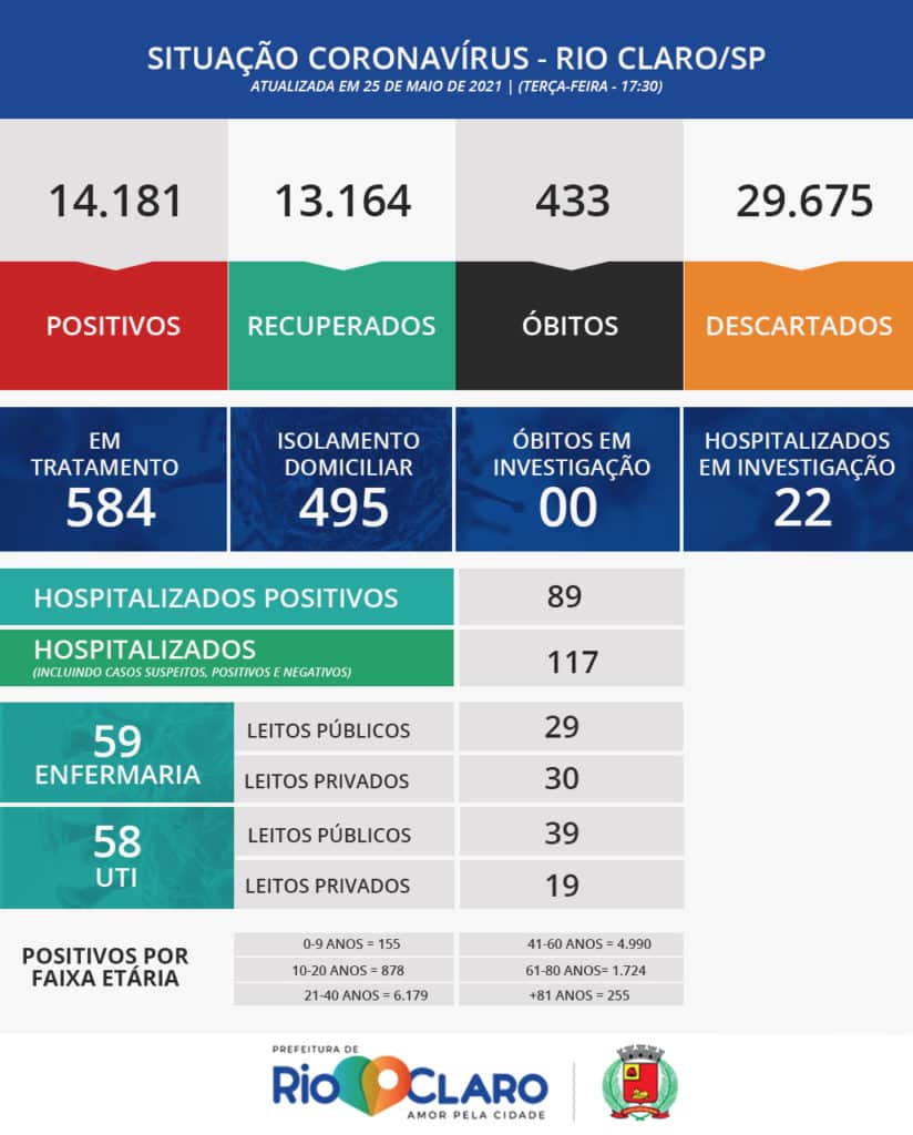 O boletim divulgado no final da tarde desta terça-feira (25) pela Secretaria Municipal de Saúde de Rio Claro registra o óbito de um idoso no município, vítima da Covid-19. O município chegou a 433 óbitos nesta pandemia.
