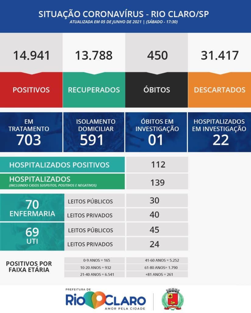 O município chegou a 450 óbitos nesta pandemia. Nas últimas 24 horas, Rio Claro registrou 116 novos casos de infecção pelo coronavírus, totalizando 14.941 casos. São 13.788 pessoas recuperadas e 591 em isolamento domiciliar.