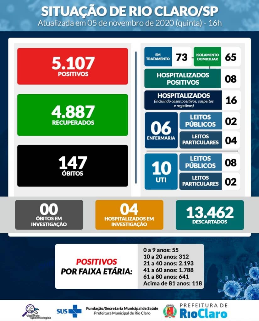 Rio Claro registrou 16 novos casos de coronavírus nas últimas 24 horas. Agora o município totaliza 5.107 casos positivos, sendo que 4.887 pessoas estão recuperadas. Dos novos casos, seis pessoas têm de 21 a 40 anos, nove de 41 a 60 anos e uma de 61 a 80 anos.