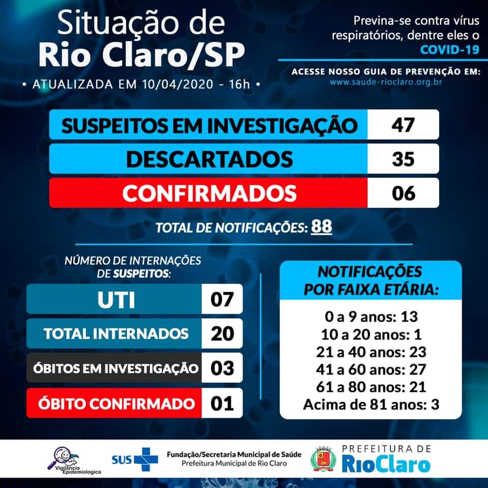 A prefeitura municipal de Rio Claro divulgou na tarde desta sexta-feira (10), um novo boletim com os números do Covid-19 na cidade. De acordo com o material, até às 16 horas deste dia 10, 88 casos foram notificados, sendo que 35 foram descartados, seis, confirmados e 47 seguem em investigação.