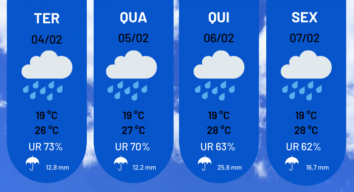 Segundo o comunicado, “o tempo desta semana será instável, com céu nublado e áreas com chuvas esparsas nos períodos da tarde ou noite”. Na publicação, o Ceapla ainda informou que as temperaturas devem ficar entre 19°C e 28°C.