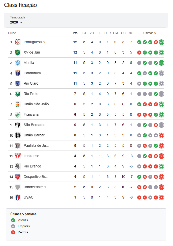 A Portuguesa Santista chega embalada após golear o Desportivo Brasil por 4 a 0 no último sábado (7). O resultado garantiu o retorno do time da Baixada à ponta da tabela, superando o XV de Jaú no saldo de gols.
