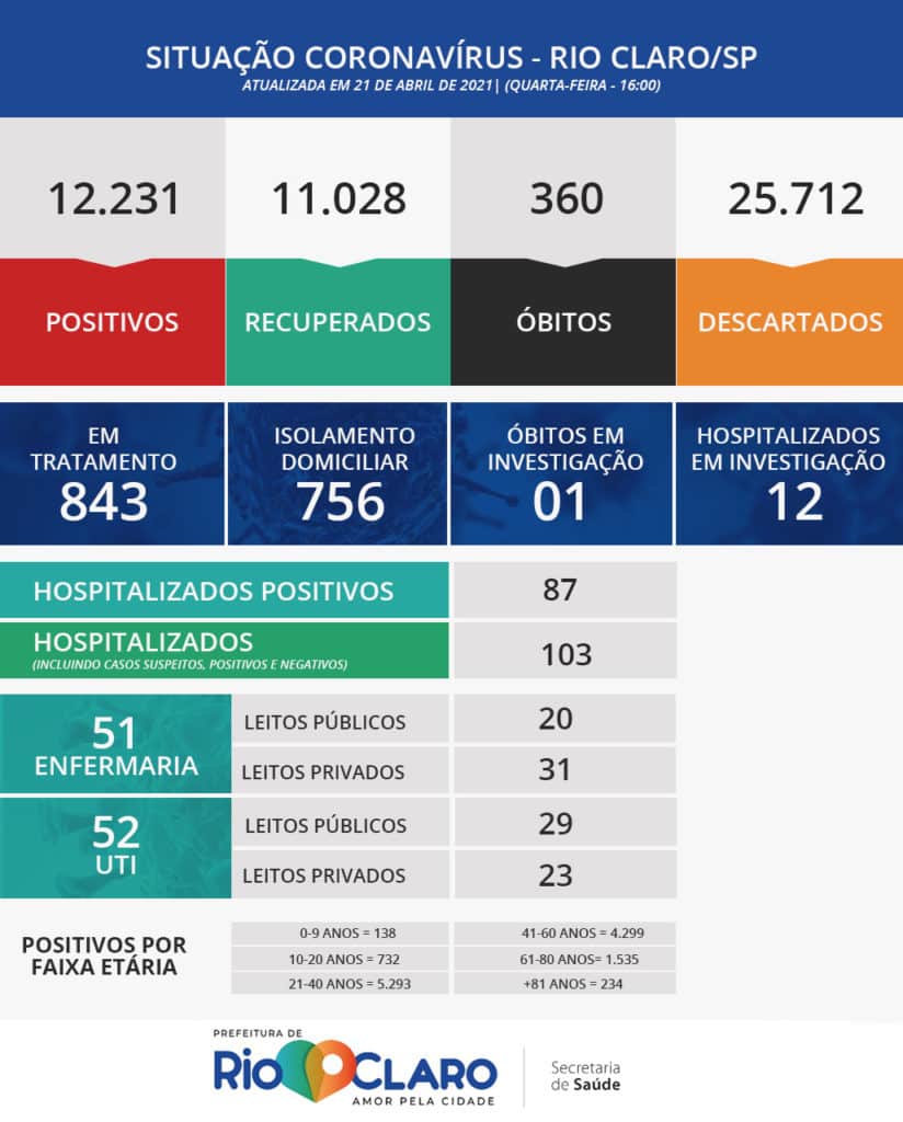 O município tem um total de 12.231 casos positivos da doença com os 14 casos registrados nas últimas 24 horas. 103 pessoas estão hospitalizadas, sendo 52 em UTI (Unidade de Terapia Intensiva). A cidade tem 360 mortes em decorrência da Covid.