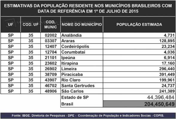 O IBGE (Instituto Brasileiro de Geografia e Estatística) divulgou na sexta-feira (28) as estimativas das populações nos 5.570 municípios brasileiros. A data de referência é 1º de julho. Estima-se que o Brasil tenha 204,5 milhões de habitantes e uma taxa de crescimento de 0,83% de 2014 para 2015. Desse total, 44.396.484 residem no Estado de São Paulo, que concentra 21,7% da população total do país.