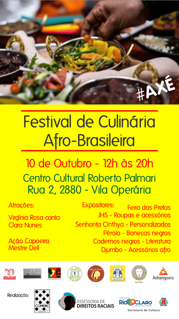 Neste domingo (10), será realizado em Rio Claro o Festival de Culinária Afro-Brasileira. O festival será no Centro Cultural Roberto Palmari, a partir das 12 horas, com venda de acarajé, moqueca de peixe, feijão gordo com linguiça, docinhos africanos e outros pratos típicos.
