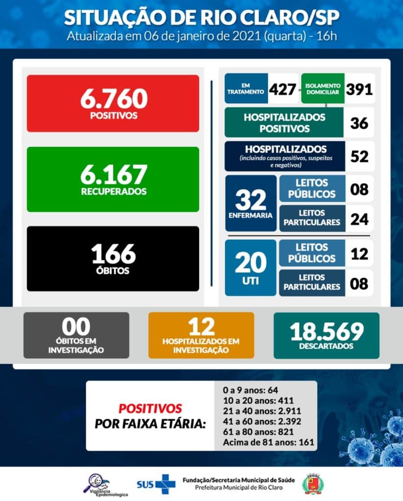 Rio Claro chegou a 6.760 casos positivos de Covid-19, sendo que 88 casos foram confirmados nas últimas 24 horas. A informação consta em boletim emitido na quarta-feira (6) pela Secretaria Municipal de Saúde, que também aponta que o município permanece com 166 óbitos provocados pela doença.