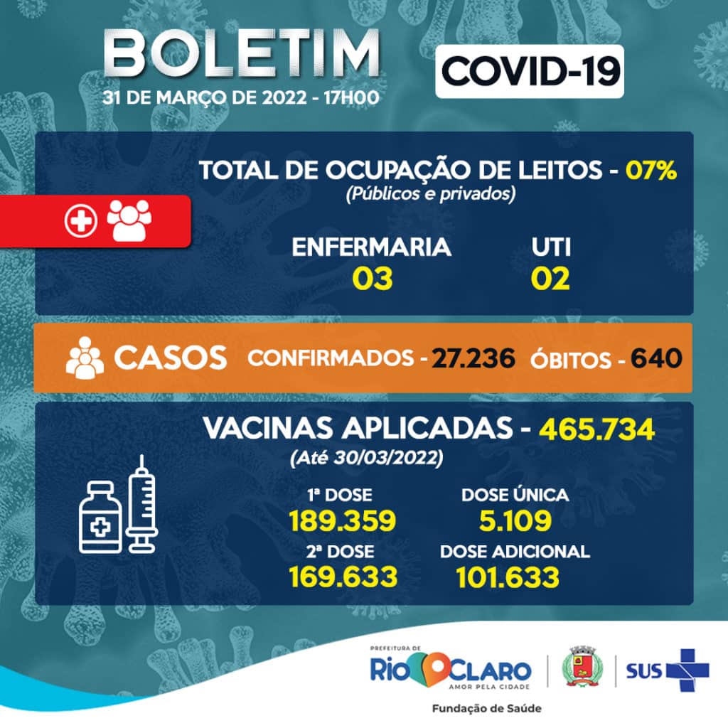 Nas últimas 24 horas, Rio Claro registrou quatro novos casos de Covid e mais quatro pessoas recuperadas da doença. As informações estão em boletim divulgado nesta quinta-feira (31) pela Fundação Municipal de Saúde. O município tem nesta pandemia total de 27.236 casos de Covid, sendo que 26.582 pessoas estão recuperadas.