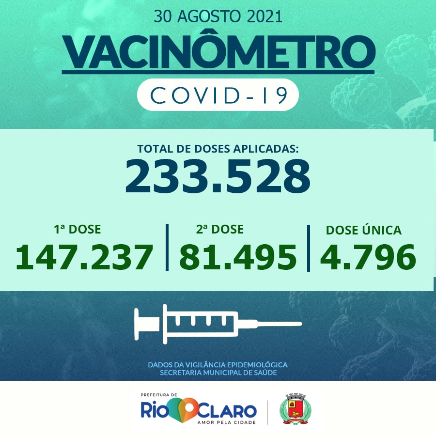 Ao todo são 233.528 doses de vacina aplicadas. O total de pessoas vacinadas com as duas doses ou com vacina de dose única é de 86.291 pessoas, o que representa 41,17% da população. Já o percentual de vacinados com ao menos uma dose é de 72,55%. Os percentuais são calculados com base em números do IBGE, que estima que a população de Rio Claro é de 209.548 pessoas.