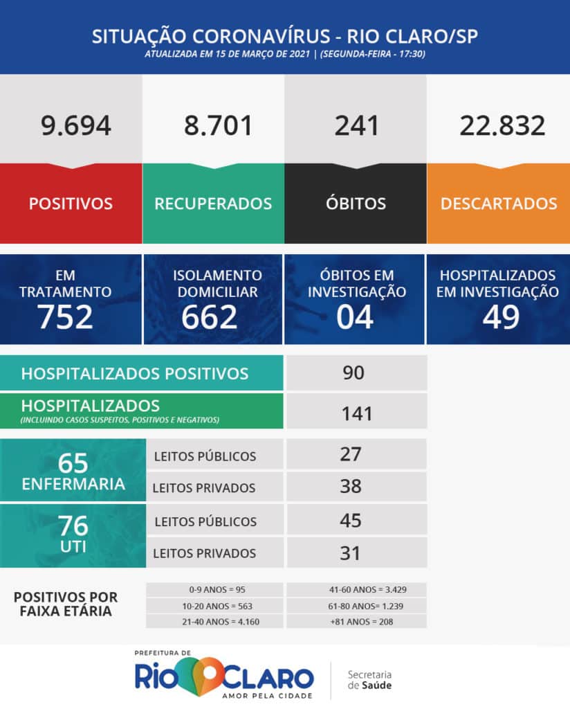Rio Claro tem um total de 9.694 casos positivos, 8.701 recuperados e 22.832 descartados.