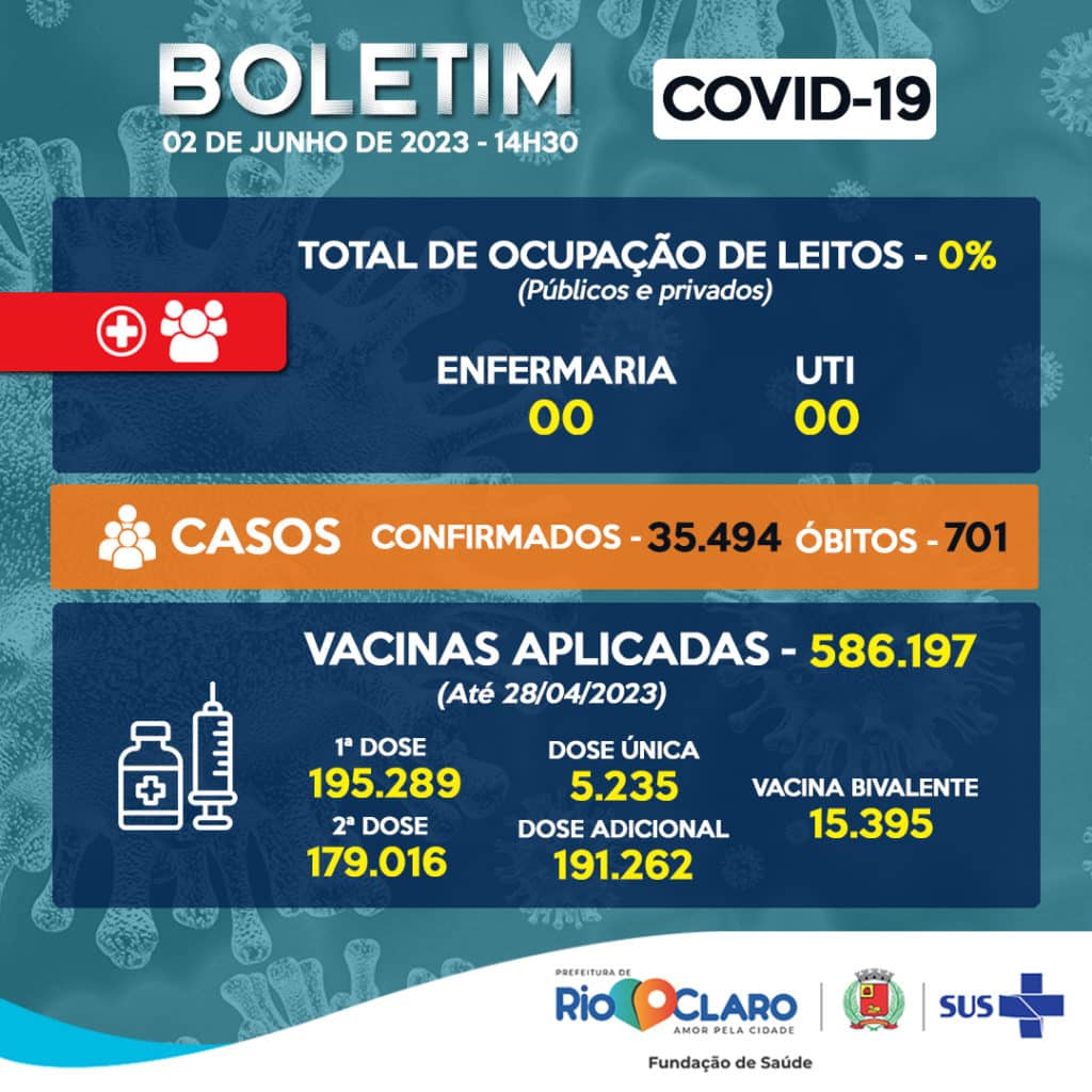 Rio Claro registrou nesta semana um novo caso de Covid, conforme aponta a Fundação Municipal de Saúde no boletim semanal divulgado nesta sexta-feira (2). O total de casos nesta pandemia é de 35.494. O boletim também aponta que Rio Claro permanece sem nenhuma pessoa internada por Covid. Dado que inclui redes de saúde pública e particular.