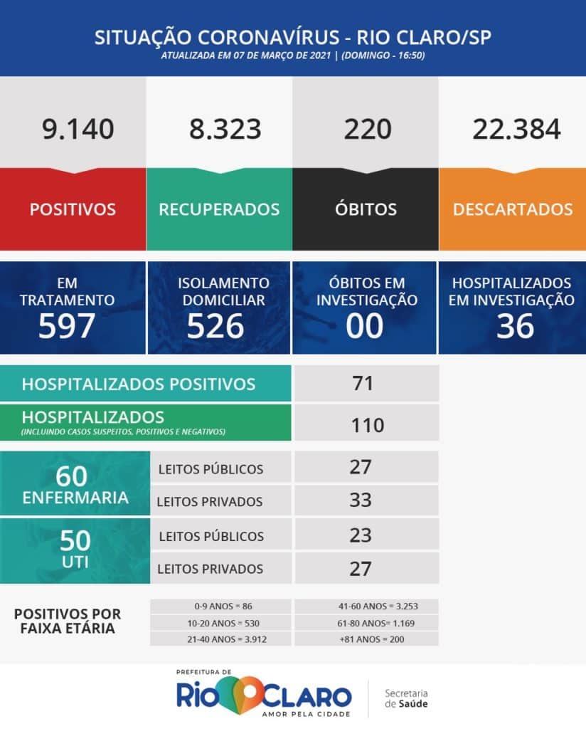 Rio Claro totaliza 220 óbitos e 110 pessoas hospitalizadas por Covid-19. Estes são alguns números do boletim divulgado no final da tarde deste domingo (7) pela Secretaria Municipal de Saúde.
