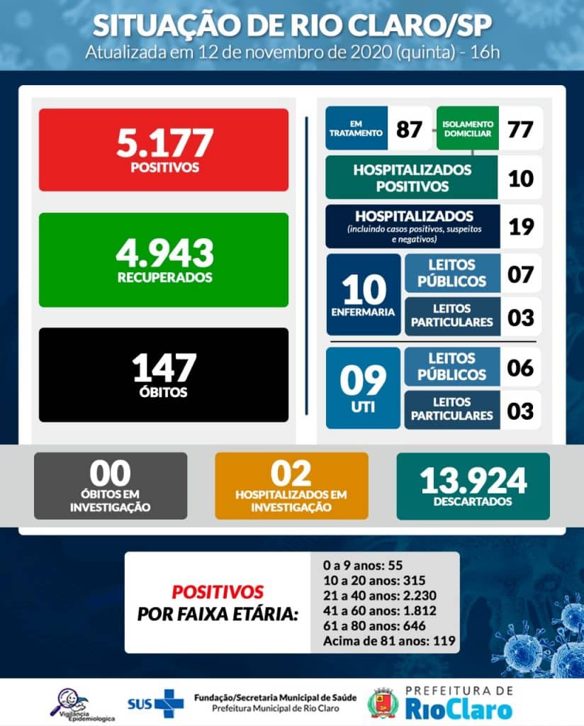 O município permanece com 147 mortes provocadas por Covid-19.O número de pessoas internadas caiu de 22, na quarta-feira (11), para 19 nesta quinta-feira. São nove internações em unidades de terapia intensiva e dez em enfermaria. Deste total, 13 pessoas estão em leitos públicos e seis em leitos particulares. Até o momento, 4.943 pessoas se recuperaram em Rio Claro da Covid.