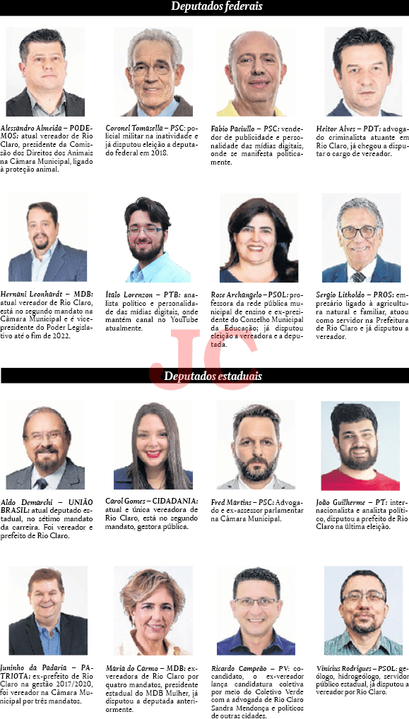 Os políticos de Rio Claro estão se lançando para o pleito com propostas que podem dar representatividade para o município. Somente os candidatos e candidatas a deputados(as) estaduais são oito postulantes, assim como os que disputarão uma vaga na Câmara dos Deputados, em Brasília, também oito. Entre eles estão atuais vereadores, ex-parlamentares da Câmara Municipal, ex-prefeito, servidores municipais e estaduais, advogados, empresários, entre outros. Confira a seguir o levantamento realizado pela reportagem do Jornal Cidade.