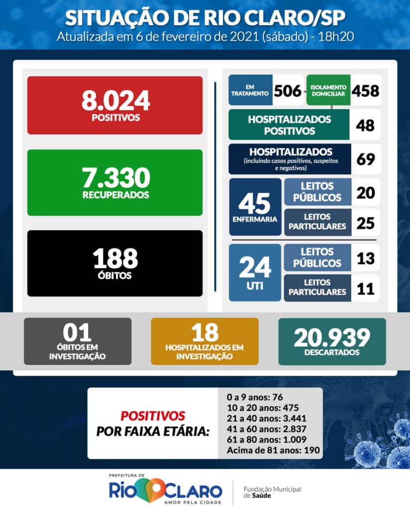 Boletim emitido no sábado-feira (6) pela Secretaria de Saúde de Rio Claro registra mais um óbito por coronavírus no município. A mais recente vítima da Covid-19 é uma idosa, e, agora, o município tem 188 mortes provocadas pela doença. O total de casos positivos chegou a 8.024, com 27 confirmações nas últimas 24 horas.