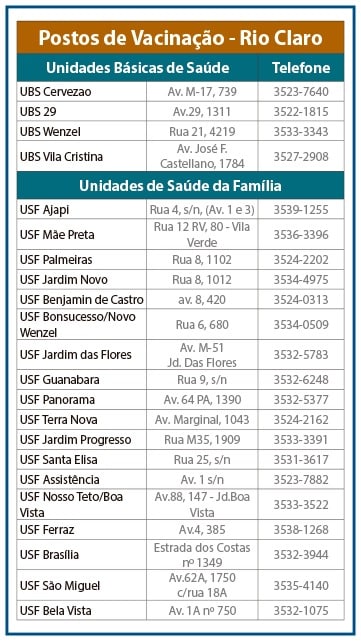 Além das quatro unidades básicas de saúde (Wenzel, Bairro do Estádio, Vila Cristina e Cervezão), Rio Claro está vacinando contra a Covid-19 em 16 unidades de saúde da família e também em posto montado pela Santa Casa. Portanto, são 21 locais espalhados pela cidade.