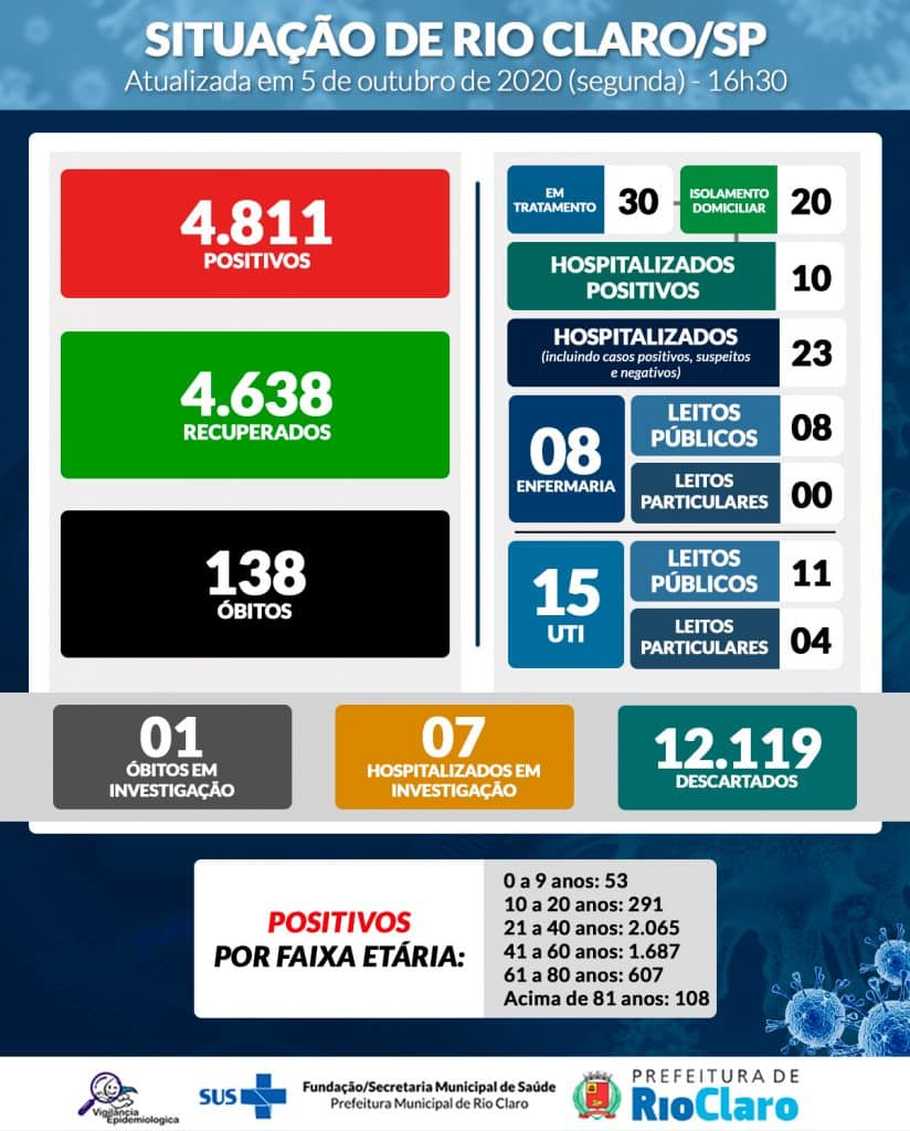 Nenhum caso de contaminação ou novo óbito decorrente do coronavírus foram registrados em Rio Claro nas últimas 24 horas e com isso o município mantém 4.811 infectados e 138 mortes pela Covid-19, de acordo com o boletim da Secretaria Municipal de Saúde emitidos nesta segunda-feira. A morte de uma pessoa idosa está sob investigação.