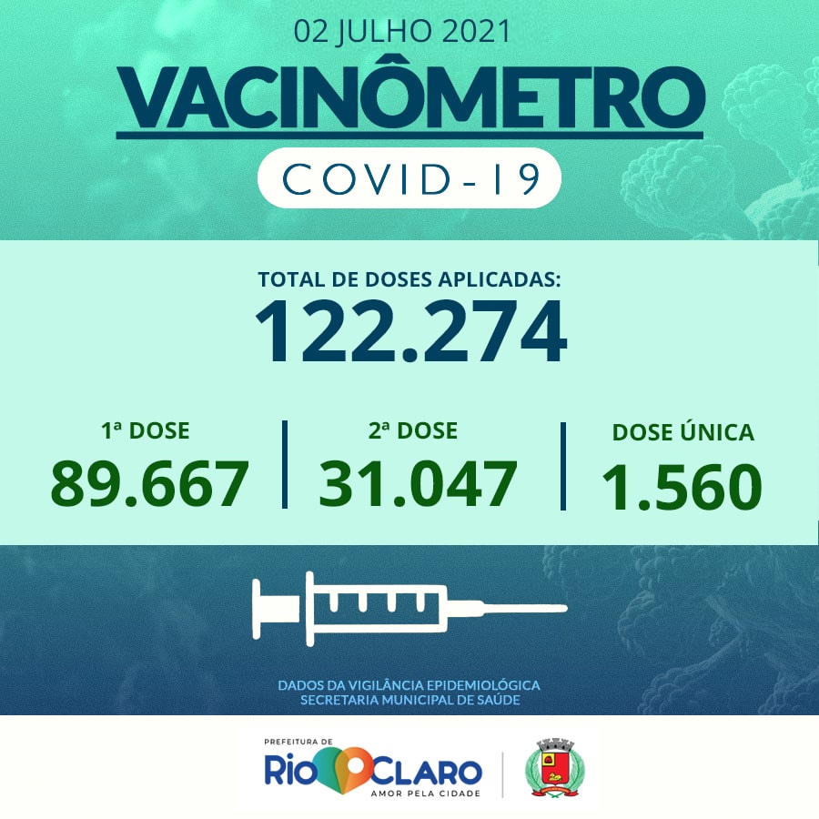 Com 1.201 doses de vacina contra a Covid aplicadas nesta sexta-feira (2), Rio Claro tem total de 122.274 doses aplicadas. Números divulgados pela Secretaria Municipal de Saúde apontam que no município, até o momento, 32.607 pessoas estão com o esquema de vacinação contra a Covid completo, o que representa 15,67% da população. Essas pessoas já receberam as duas doses da vacina ou foram imunizadas com vacina de dose única.