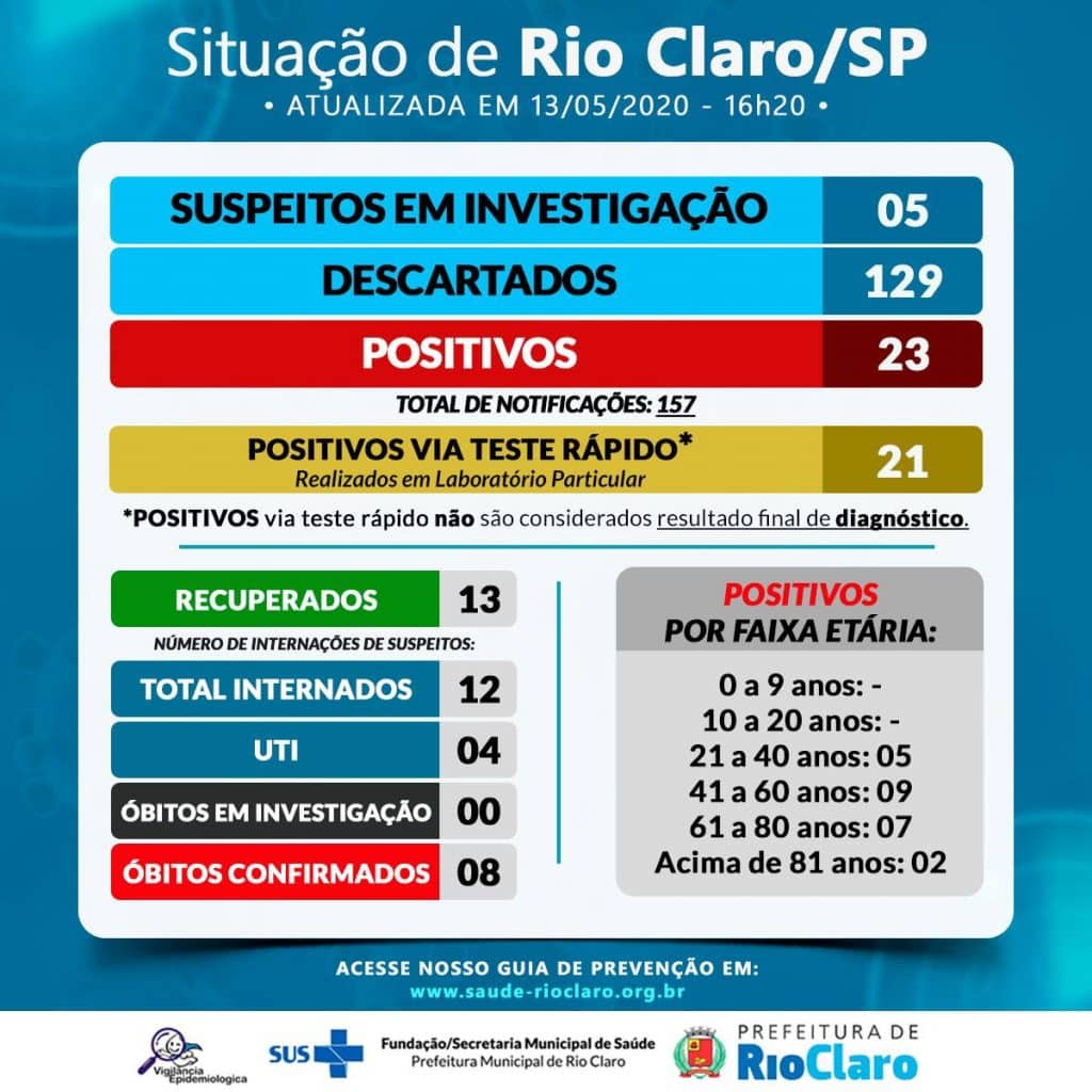 O novo boletim divulgado ontem(13) a noite pela Secretaria de Saúde de Rio Claro registra 44 casos de coronavírus no município, sendo 21 deles resultados de testes rápidos que precisarão ser confirmados em exames laboratoriais.