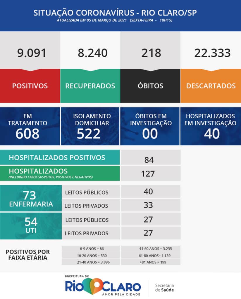 O setor de Vigilância Epidemiológica do município divulgou na noite desta sexta-feira (5) boletim que aponta um total de 9.091 casos positivos de Covid-19 em Rio Claro. Nas últimas 24 horas, foram registrados 80 novos casos e o falecimento de um homem e uma idosa, totalizando 218 óbitos.