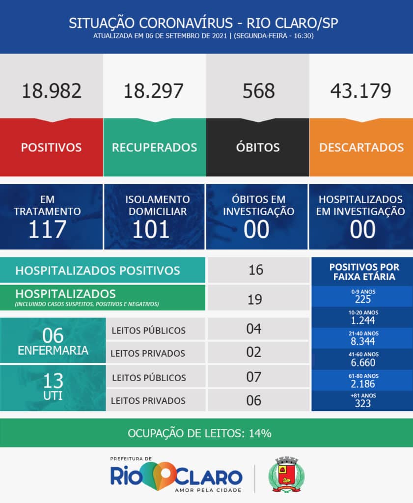 Com oito novos casos de coronavírus, Rio Claro totaliza 18.982 casos de Covid nesta pandemia. Os números divulgados nesta segunda-feira (6) pela Secretaria Municipal de Saúde apontam que deste total 18.297 pessoas estão recuperadas.Nas últimas 24 horas o município não registrou óbito pela doença, que fez 568 vítimas fatais em Rio Claro. Há 101 pessoas assintomáticas ou com sintomas leves de Covid em isolamento domiciliar.Em hospitais públicos e particulares, estão internados 19 pacientes, sendo 13 em UTI.
