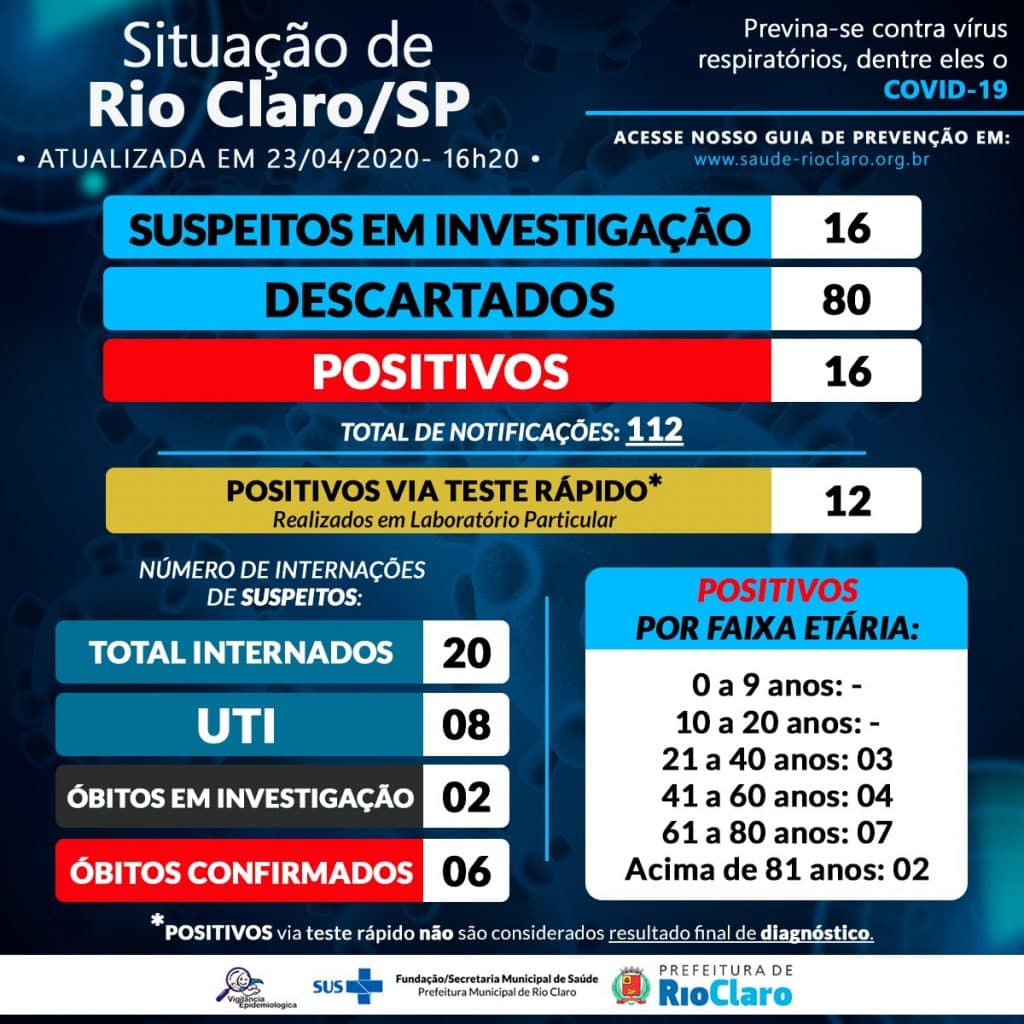 Os dados constam de boletim divulgado no final da tarde desta quinta-feira (23) pela Secretaria Municipal de Saúde. O município também registrou um novo óbito suspeito que está em investigação. Com isso, Rio Claro tem ainda duas mortes suspeitas de coronavírus em investigação.