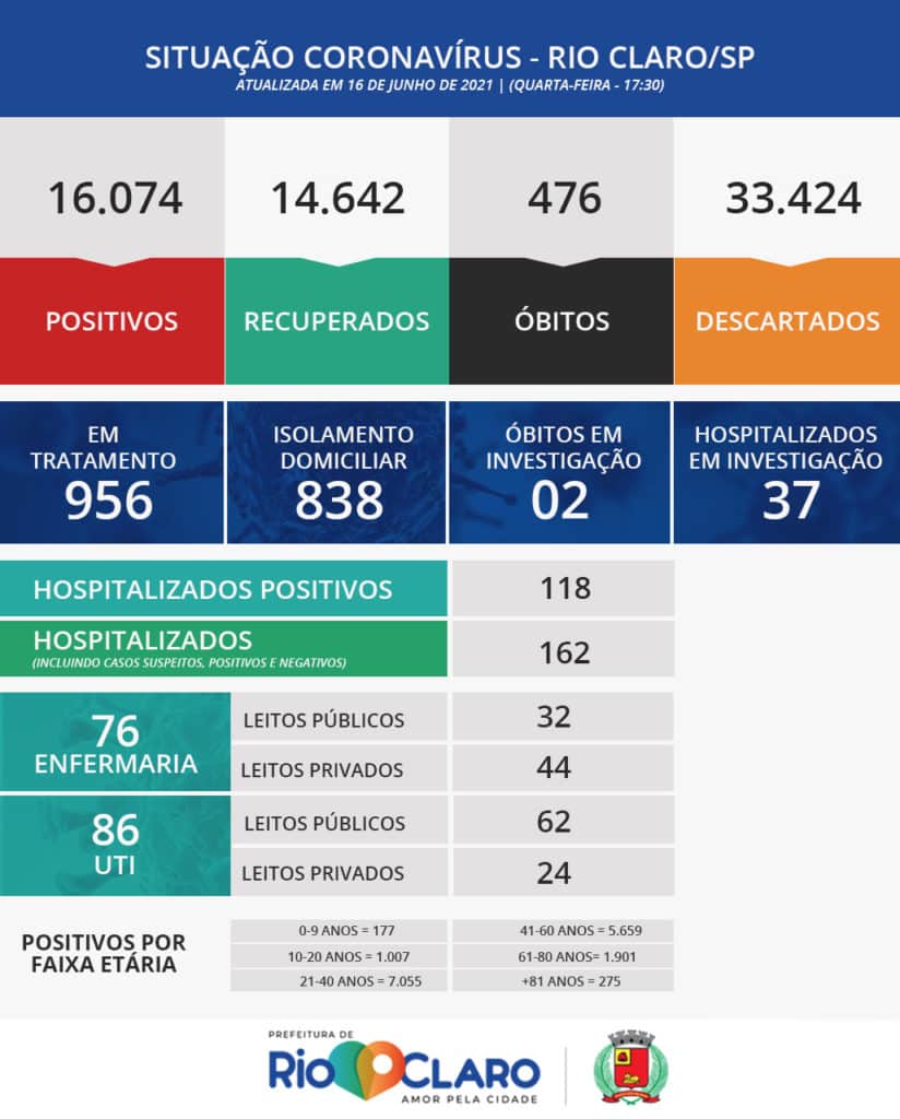 Com a confirmação de cem novos casos de Covid, Rio Claro ultrapassou nesta quarta-feira (16) a marca de 16 mil casos da doença. Ao todo 16.074 pessoas foram infectadas pelo coronavírus desde o início da pandemia, conforme aponta boletim emitido pela Secretaria Municipal de Saúde.