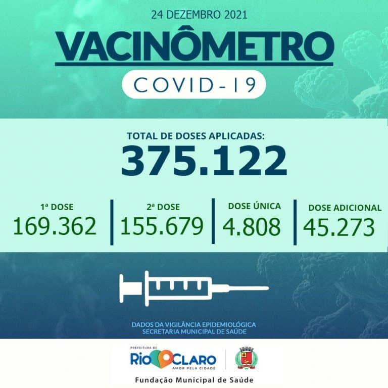 Com a aplicação de 817 doses contra a Covid na quinta-feira (23), Rio Claro chegou a 375.122 doses nesta campanha de vacinação. No plantão de quinta-feira, no shopping, foram aplicadas 28 primeiras doses, 143 segundas doses e 646 doses adicionais (reforço). Os números foram divulgados pela Fundação Municipal de Saúde, que aponta que até o momento o município vacinou 174.167 pessoas contra a Covid, ou seja, 83,11% dos rio-clarenses. Deste total, 160.487 pessoas, o que representa 76,58% da população, receberam as duas doses da vacina ou vacina de dose única. E 21,6% dos rio-clarenses tomaram também a dose de reforço. Os percentuais são calculados com base em números do IBGE, que estima que a população de Rio Claro é de 209.548 pessoas.