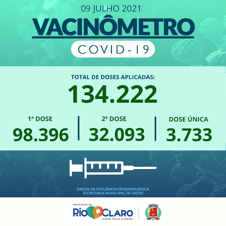 Em Rio Claro, a vacinação contra a Covid até nesta sexta-feira (9) atendeu 102.129 pessoas, conforme números da Secretaria Municipal de Saúde. O total de doses aplicadas é 134.222, sendo 98.396 primeiras doses, 32.093 segundas doses e 3.733 doses únicas. Somente nesta sexta-feira foram aplicadas 1.539 doses, em plantão realizado na Faculdade Anhanguera e no Centro Cultural.