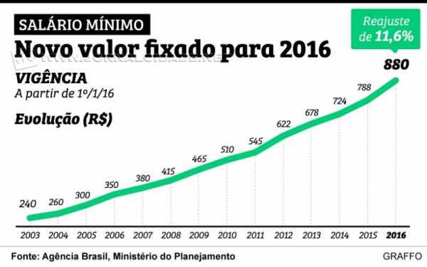 O salário mínimo passa a valer R$ 880 a partir do dia 1º. São R$ 92 a mais do que o valor anterior de R$ 788. O reajuste de 11,6% terá impacto direto para cerca de 40 milhões de trabalhadores e aposentados que recebem o piso nacional e, segundo o Ministério do Planejamento, Orçamento e Gestão, a medida causará impacto de R$ 30,2 bilhões nas contas públicas em 2016.