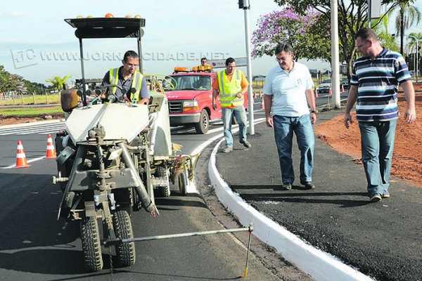 O secretário municipal de Mobilidade e Sistema Viário, José Maria Chiossi, e o diretor Luís Carlos Luz estão acompanhando desde o início da semana o trabalho das equipes na execução da nova sinalização viária.