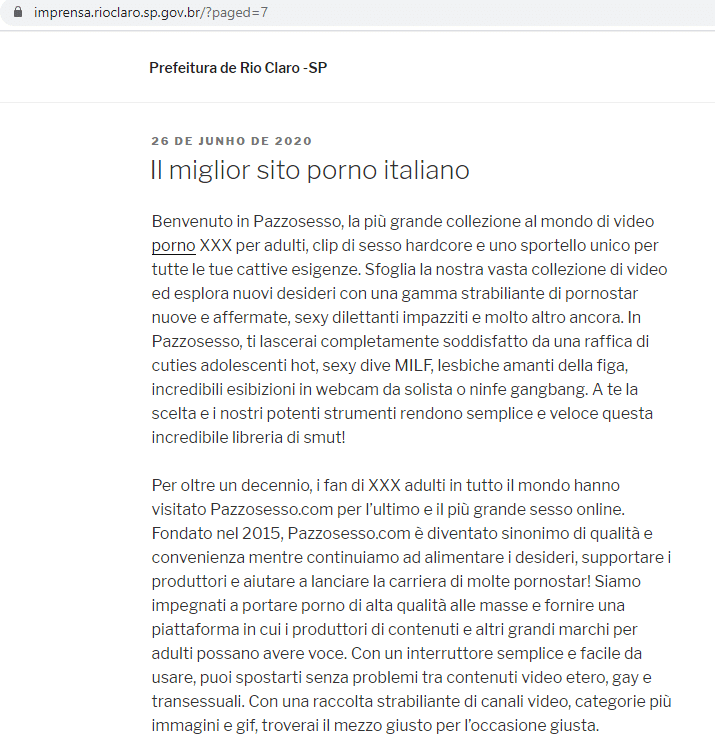 Circulou na manhã desta segunda (13) em Rio Claro um link do site da Prefeitura Municipal que continha um texto sobre um canal pornográfico italiano (confira print abaixo). A postagem estava entre as notícias divulgadas pela administração municipal
