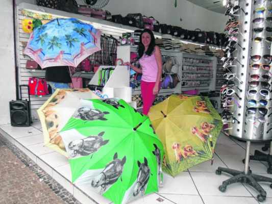Há produtos para todos os gostos e bolsos e de tamanhos variados. Creusa explica que os homens são mais tradicionais e preferem guarda-chuvas de cores sóbrias, preto, marrom, xadrez. Têm ainda as sombrinhas de motivos infantis. Para as mulheres, desenhos e cores variadas. Segundo a gerente, no momento os itens de maior saída são os guarda-chuvas decorados com animais: cães, gatos e cavalos. Um mais fofo que o outro.