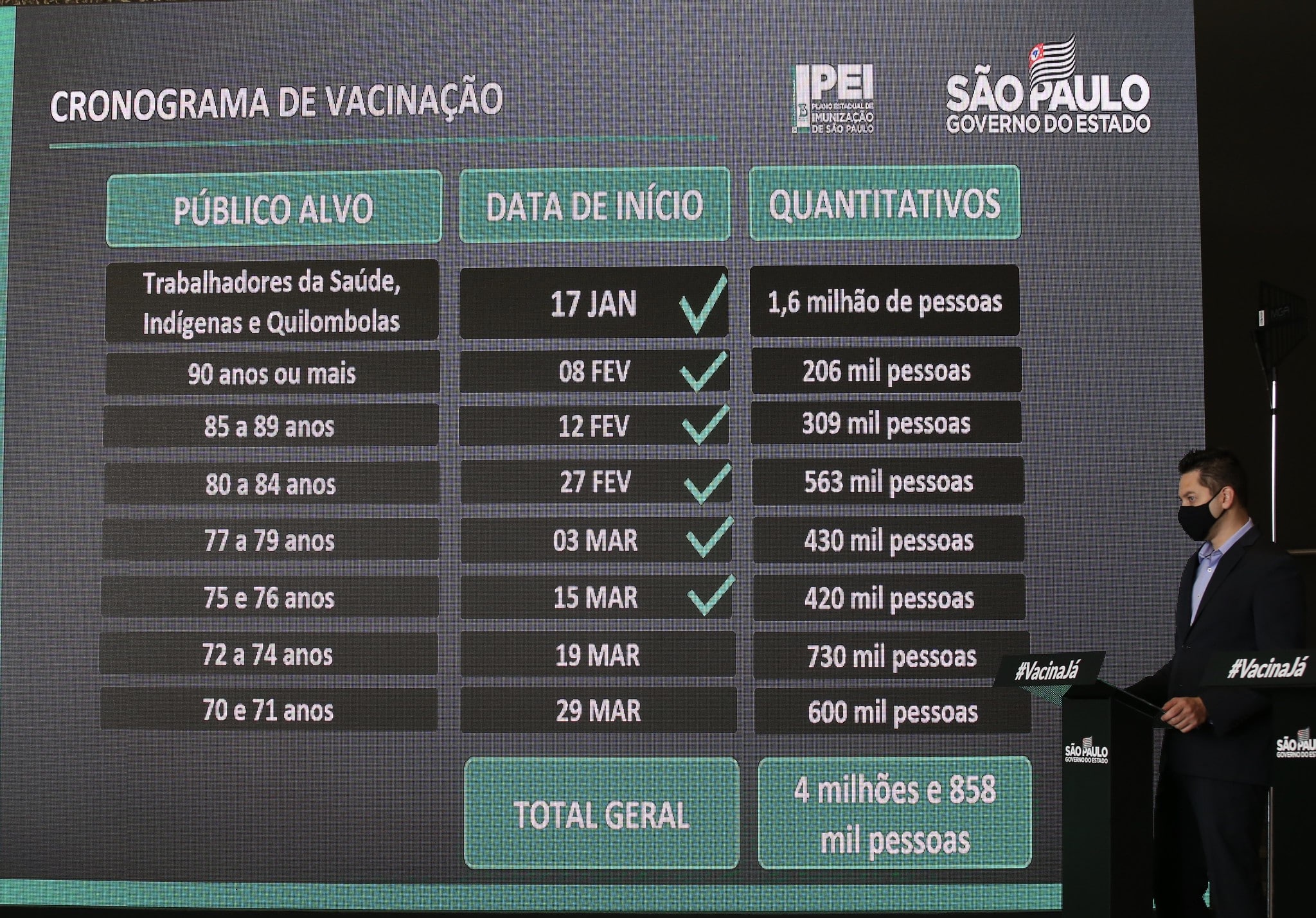 Nesta segunda-feira (15), o Governo do Estado também anunciou, para ainda no mês de março, dia 29, o início da vacinação para pessoas de 70 e 71 anos, computando um total de 4,9 milhões de pessoas com vacinação garantida, somando todos os públicos já anunciados.