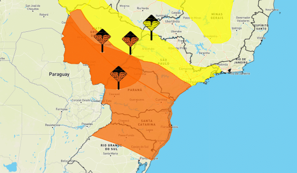 Cinco estados do centro-sul do país estão em alerta de risco de tempestade até a manhã desta terça-feira (9), segundo o Inmet (Instituto Nacional de Meteorologia): São Paulo, Mato Grosso do Sul, Paraná, Santa Catarina e Rio Grande do Sul.