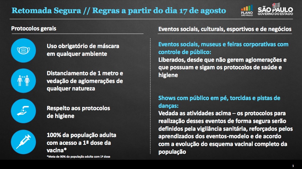 “A partir de 17 agosto teremos toda a população [adulta do estado de São Paulo] com acesso à primeira dose [de vacina contra a covid-19]. Com isso, eventos sociais, corporativos, culturais e esportivos passam a ser permitidos em um modelo onde não há restrição de ocupação, mas permanece a restrição de distanciamento. Então, o cálculo de ocupação precisa ser realizado, porque não pode haver aglomeração, e as pessoas precisam estar distanciadas. O uso de máscaras permanece”, disse Patricia Ellen, secretária de Desenvolvimento Econômico.