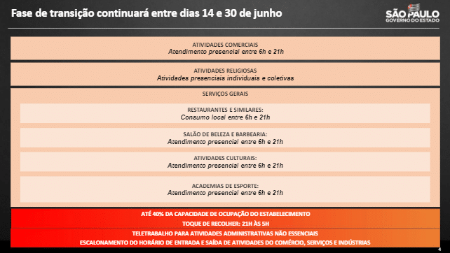O Governador João Doria anunciou nesta quarta-feira (9) a prorrogação da fase de transição do Plano São Paulo para todo o Estado até o dia 30 de junho. As regras atuais permanecem as mesmas: funcionamento das atividades econômicas até as 21 horas e permissão de 40% de ocupação nos estabelecimentos.