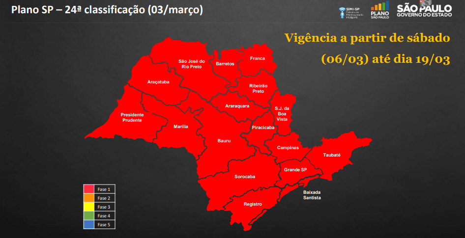O Governador João Doria confirmou nesta quarta-feira (3) que todos os 645 municípios do estado regridem para a fase vermelha do Plano São Paulo a partir deste sábado (6). A etapa mais rigorosa de restrição de mobilidade urbana e serviços não essenciais fica em vigor até o próximo dia 19 devido ao aumento alarmante de casos, internações e mortes causadas pelo coronavírus.