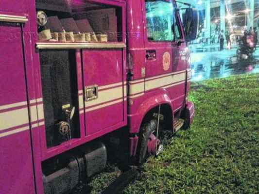 Leitor enviou foto de viatura do Corpo de Bombeiros que ficou atolada em canteiro da Visconde