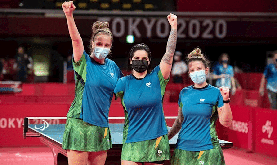 As brasileiro Daniele Rauen, Bruna Alexandre e Jennyfer Parinos asseguraram o bronze para o país na disputa feminina por equipes no tênis de mesa, classe 9-10 (deficiência física, com menor comprometimento físico-motor) na Paralimpíada e Tóquio (Japão). A terceira medalha do Brasil na modalidade nesta edição – Bruna faturou prata e Cátia Oliveira bronze – veio após a semifinal contra a Polônia na manhã de hoje (1). O trio foi superado pelas polonesas, por 2 a 0, e ficou com o bronze, pois não há disputa de terceiro lugar no tênis de mesa na Paralimpíada.