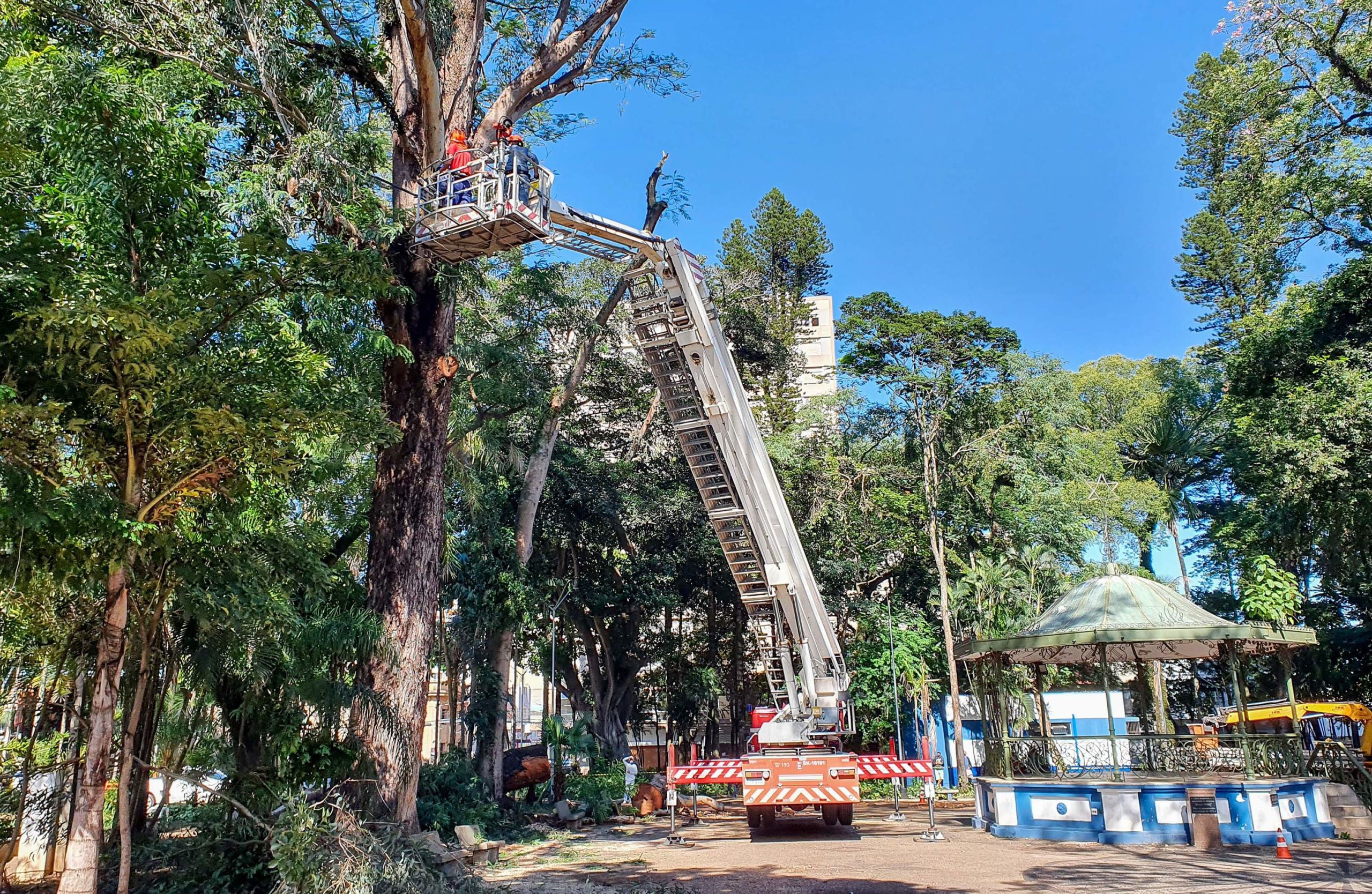 O trabalho de retirada do eucalipto que tombou foi feito na segunda-feira pela prefeitura. Para remover o outro eucalipto, a prefeitura contou na quarta-feira (10) com o apoio do Corpo de Bombeiros, mas o equipamento dos bombeiros apresentou problema técnico.