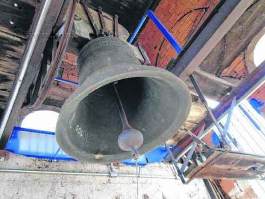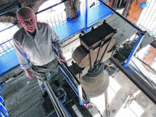 A imponente torre tem cerca de 300 degraus. Além do sino principal que marca as horas, há outros dois que são acionados durante encontros litúrgicos. “O sino principal, que marca as horas, pesa 550 quilos e toca a nota musical Sol. Os demais, um de 410 kg (nota Lá) e outro com 310 kg (Si), são acionados manualmente para anunciar a hora das celebrações litúrgicas”, explica o pároco. Cada sino tem um motor independente, com comandos próprios, bem como um balancim, que aciona o balanço. O que marca as horas tem dois pesos – um faz o relógio funcionar e pesa 136 kg; o segundo faz bater as horas.