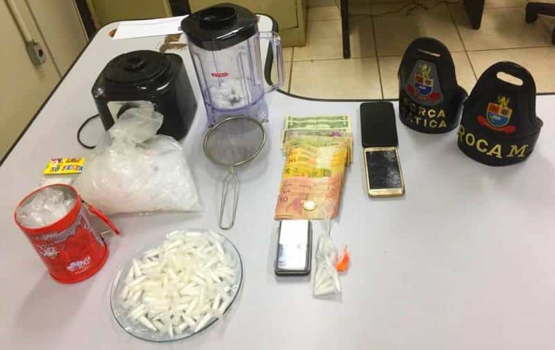 Foram encontrados R$ 171, 164 pinos grandes de cocaína, 1 balança de precisão, 1 peneira, 1 liquidificador, 1 prato com 0,031 gramas de cocaína, 2 celulares, além de milhares de embalagens vazias. Os suspeitos foram levados ao Pronto-Socorro do Hospital São Luiz para exames de corpo delito e, em seguida, levados ao Plantão da Central de Polícia Judiciária. O homem foi preso em flagrante e os menores foram liberados aos pais.