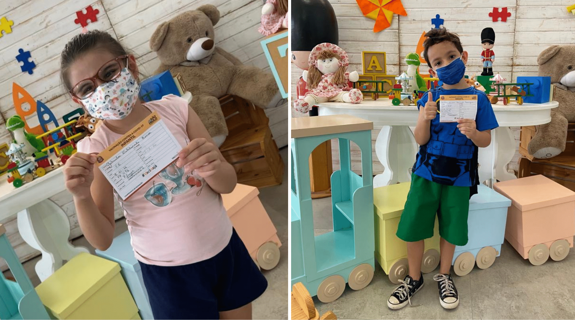 E devidamente trajado de super-herói, Alexsander Samuel Rodrigues, de seis anos, acompanhado da mãe, Karina Pancher Rodrigues, que atua na saúde, e do irmão, Vitor Manuel, que já foi imunizado, recebeu sua primeira dose. “Não via a hora dele poder tomar também, é um alívio imenso”, relata a mãe.