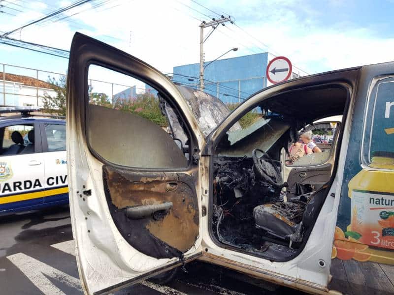 Um veículo pertencente a uma empresa de sucos pegou fogo e ficou quase que totalmente destruído na área central de Rio Claro na tarde desta sexta-feira (7).