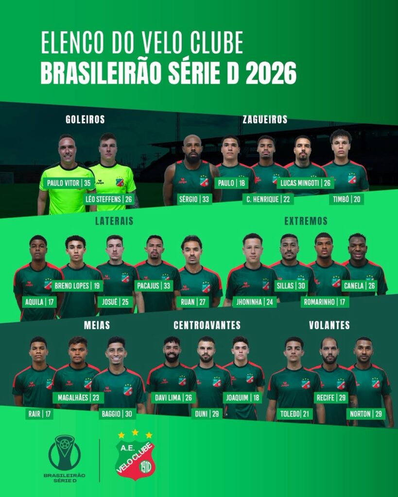 O Velo Clube anunciou oficialmente o elenco que irá disputar a Série D do Campeonato Brasileiro em 2026. A montagem do grupo foca na manutenção de peças que já conhecem a estrutura do Rubro-Verde, somada à chegada de atletas experientes e a promoção de jovens talentos das categorias de base para a competição nacional.
